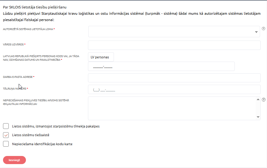 Pieteikums tiek apstrādāts saskaņā ar spēkā esošajiem datu aizsardzības noteikumiem. Dati tiek izmantoti tikai piekļuves nodrošināšanai SKLOIS.
